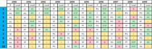 19 PG לעומת 6 בלבד שנבחרו בטופ 10 בכל העשור של שנות ה 80. בשנות ה 90 נבחרו לא פחות מ 19 רכזים בבחירה טופ 10 , 5 מתוכם בבחירה ה 2.
