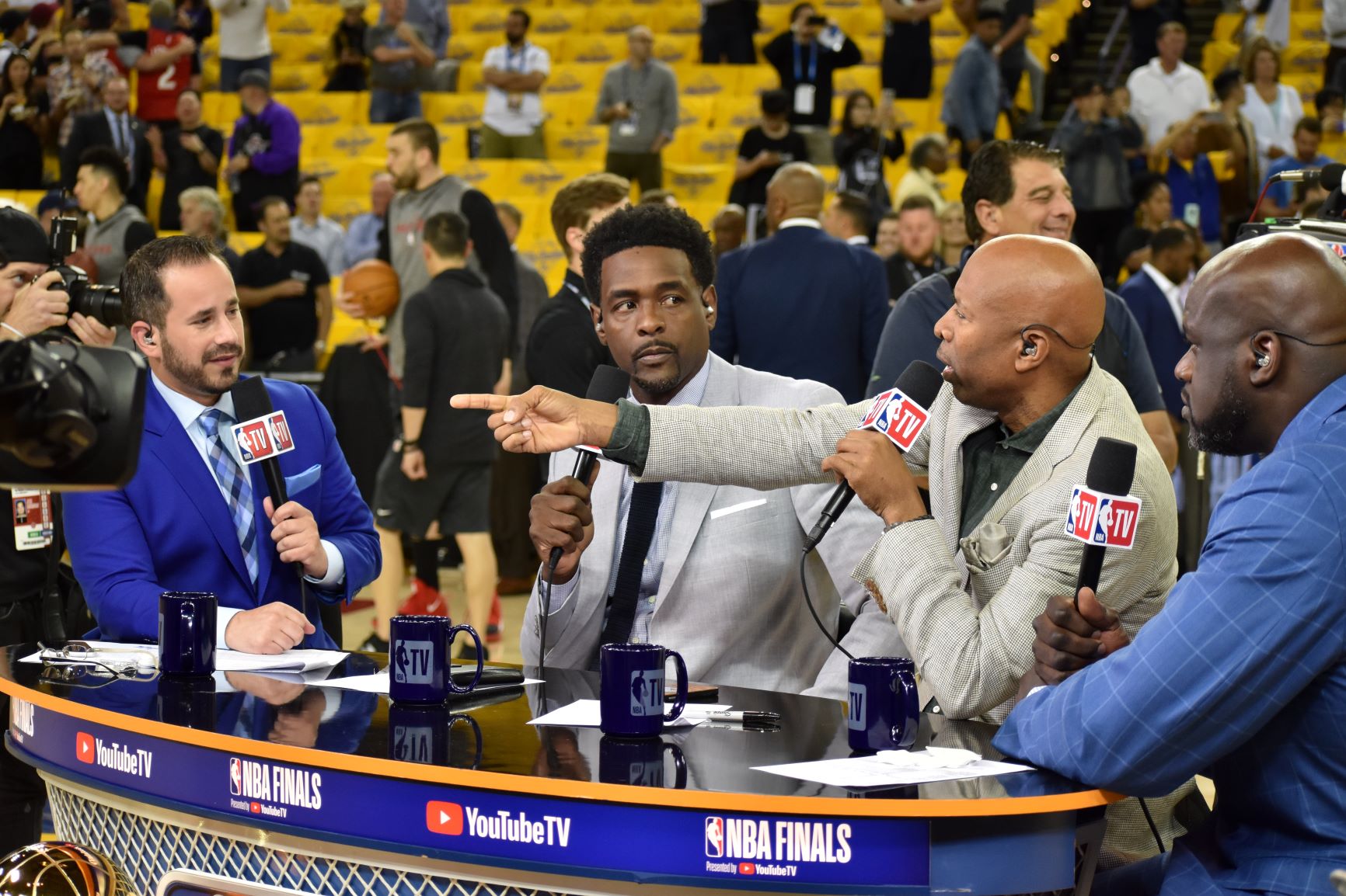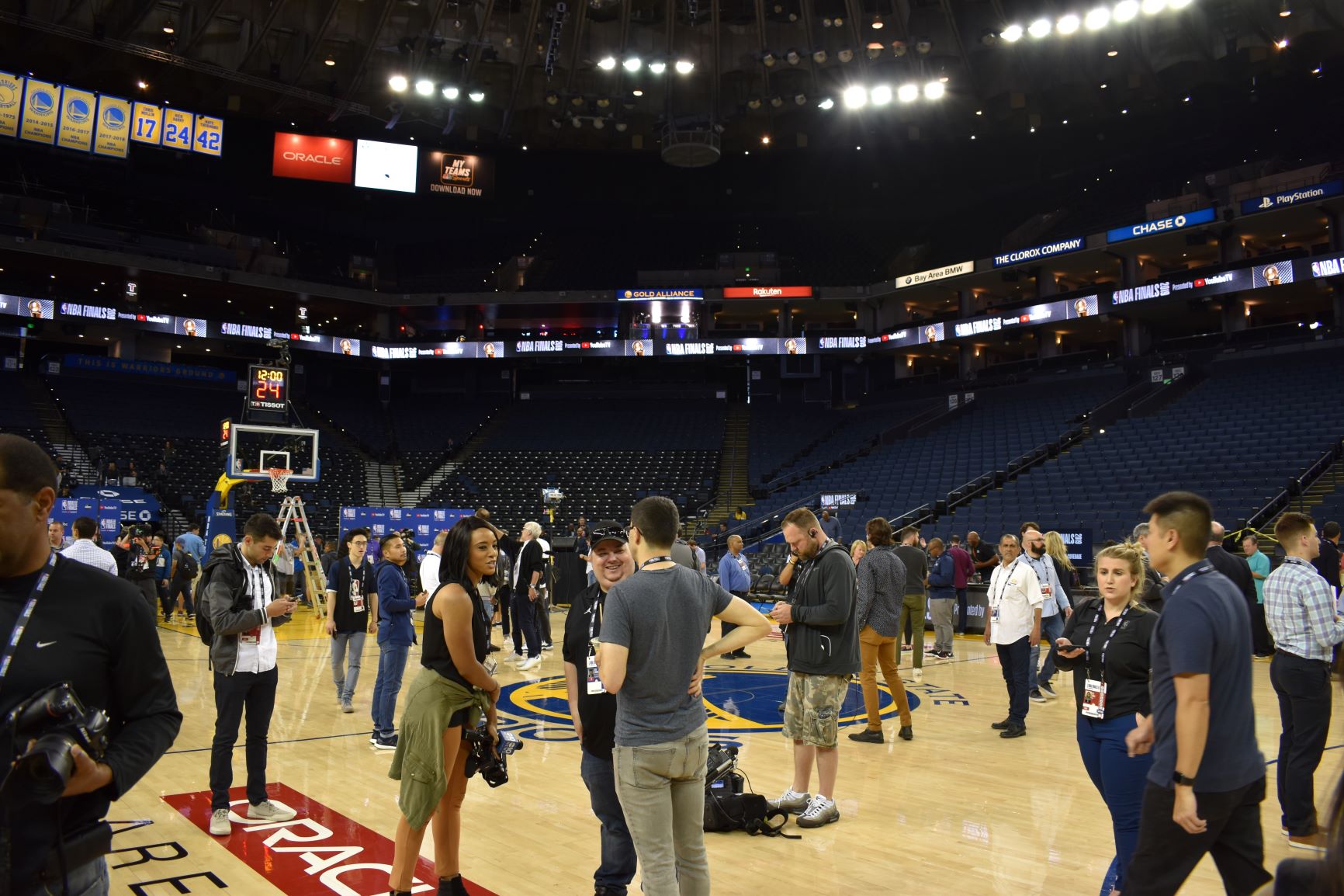 בו-זמנית משהו כמו 10 מוקדי ראיונות. בחדר הפנימי סטיב קר מתראיין, בעוד שעל הפרקט בשני צידי הסל איגודאלה ודריימונד, ועל הספסל קווין קוק, ובסל השני ג'ורדן בל, ירבנקו, וארנדו בוגוט. סטיב קר מסיים בחדר הפנימי ומגיע לראיון על הפרקט, ואז קליי נכנס לחדר. והכל רץ כמו שעון כיוון שתוך חצי שעה בדיוק כל המסיבה הצהובה-כחולה תתפזר ומגיעים הראפטורס והראיונות איתם מתחילים.