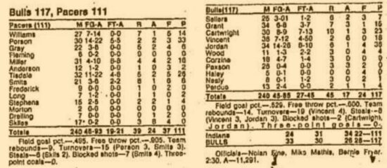 ג'ורדן סיים עם 36 נקודות, ש-17 מהן באו ברבע האחרון. הוא פתח את הרבע הרביעי בחדירה ללייאפ, שהעלתה את הבולס ל 91-89, ואז הוסיף עוד פאול-סל כדי לעלות ליתרון 5.