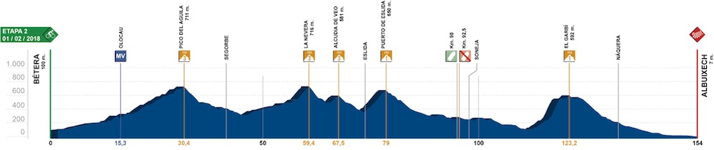 קטע 2 כבר מביא אותנו אל התכלס של המירוץ, עם שתי פסגות בדרגה 1, שיגיעו אחרי שלוש מדרגה 3. ברור שמדובר כאן בקטע למטפסים מסוגו של ואלוורדה, אלא שהמרחק הרב בין הפסגה האחרונה לסיום הקטע מרמז על כך שהמאבק בין המטפסים יידחה להמשך המירוץ. שידור ביורוספורט החל מהשעה 16:00.