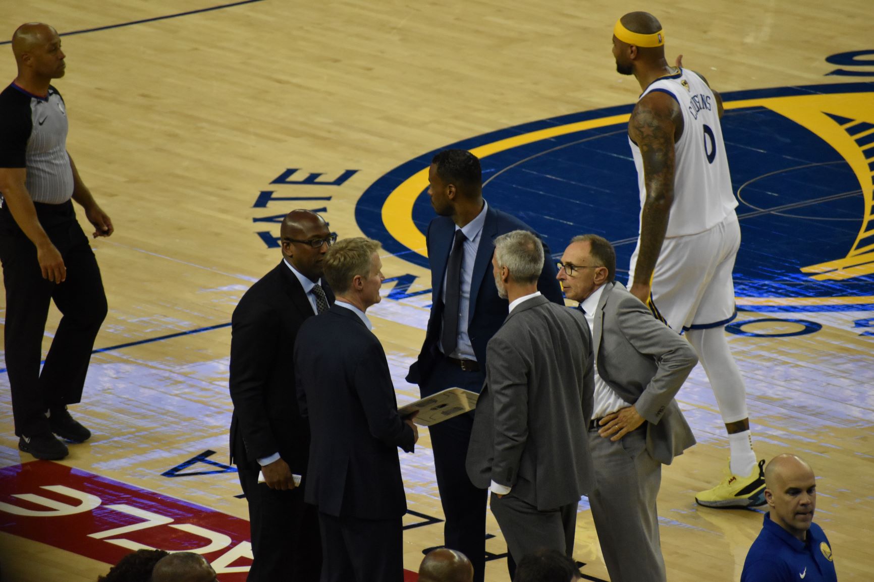 סטיב קר והצוות שלו עושים חושבים באמצע הרבע השני, בעוד קאזינס הולך לשופט להתלונן: