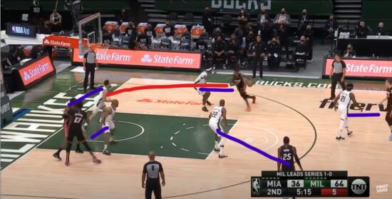נתחיל מהרבע הראשון של משחק 3, הרבע הכי חלש התקפית של מיאמי בסדרה, ובהצגת האיום ההגנתי של מילווקי בצבע באופן שמונע אפילו זריקות. בינתיים השמירות מסודרות כשאריזה מקבל את השומר החלש יותר, ולכן הוא זה שבא לחסום לבאטלר, עליו שומר יאניס.
