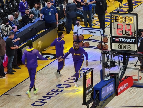 לייקרס עלו לחימום הסופי לצד שריקות בוז מהקהל ומהצד השני שחקני גולדן סטייט בלבוש חגיגי ולבן מחכים ומצפים לעלות לפרקט לכבוד טקס חלוקת טבעות האליפות.