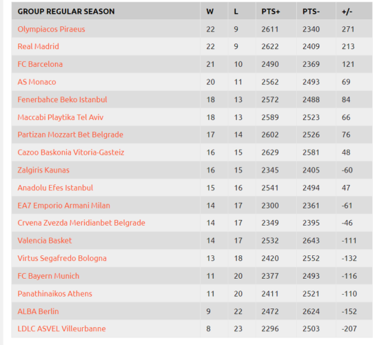 הערב תארח מכבי את מילאנו, והפעם בשעה הרגילה, במסגרת המחזור ה-32 של היורוליג. 3 מחזורים לפני סיום העונה הרגילה, והחלטנו שזה הזמן המתאים להתעסק עם כל התרחישים של מאבקי המיקום ביורוליג. נתחיל עם הצגת הטבלה, נעבור לסקירה כללית של אילו קבוצות נמצאות באיזה מאבק ואחר כך נסקור כל קבוצה בנפרד.