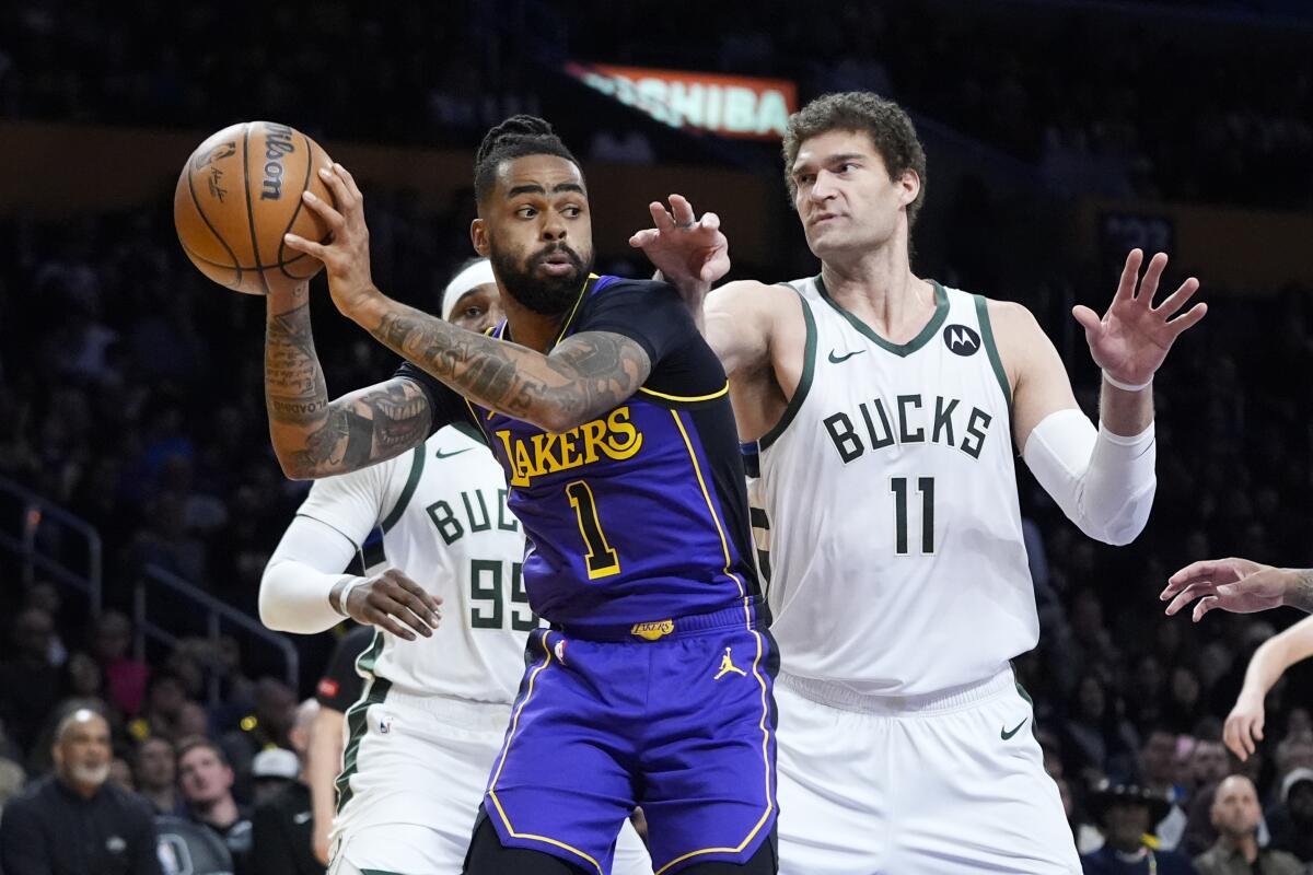 First, it was Russell, as he did all night, breaking down the Milwaukee defense and putting in a 13-footer with his left hand. With the Lakers needing one last stop, Spencer Dinwiddie, the Angeleno native making his first start for the team (in James’ place), smothered Lillard and blocked a potential game-winner in the final seconds, securing an emotional 123-122 win.