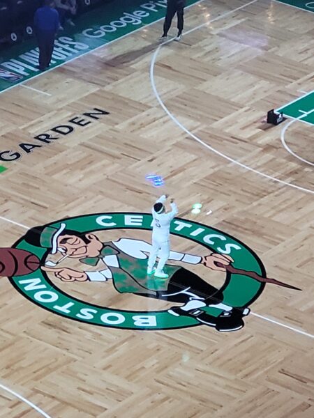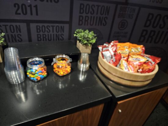 הלכתי על בדיקה מקיפה של הבופה. הגארדן בסידור לחג הפלייאוף, מה שאומר שסדרים ישנים משתנים. חדר האוכל פינה את עצמו לטובת שימוש של עיתונאים נוספים, וחדר חלופי נפתח באיזור אחר. בתפריט אוכל אסייתי, סלט ירוק שנראה טרי כמו בישראל, ועמדת גיוזות וסיגרים (שאינם מרוקאים). כל זה תמורת השקעה של עשרה דולר מצד העיתונאים. שווה. אחד החידושים לפלייאוף הוא עמדת החטיפים והמתוקים ליד מושבי הכתבים (הלא מיוחסים). את העיתונאים מכלי התקשורת המשמעותיים מושיבים בקומה נמוכה בערך בחצי הגובה של האולם, ואני יושב בקומה הכי עליונה, מוקף בכלי תקשורת מטיוואן, לטביה ועוד. הדבר המדהים הוא, שלמרות שזו הקומה האחרונה – רואים נהדר, ובנוסף, זו קומה מרווחת וכייפית. את צמד הברמנים כבר צילמתי לכם בעבר, והם מקור מידע משמעותי להלך הרוח הבוסטונאי – השיח היום הוא סביב קבוצת ההוקי הובילה 3:1 על טורנטו ואתמול הפסידו בבית. אין ציפייה שהסלטיקס יילכו בעקבותיהם.