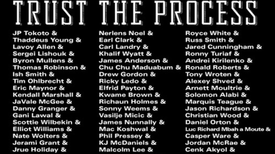 התחלנו לדבר על פילדלפיה, אז בקבוצת הכדורסל שלהם הגיעו למיצוי בעונת 2013 ומחליטה שנמאס לה מהבינוניות. מתמנה סם הינקי ולוקח את הסיקסרס לתקופת בניה מחודשת. הם מוציאים את כל הסלעים הכבדים תמורת בחירות או זוג גרבים/מדפסת. ומתחילים לנסות למצוא את הכוכבים שיביאו לעיר אליפות ראשונה מאז דוקטור ג'יי ב-83. האבנים מתחלפות מהר מאוד ובתוך כ-3 עונות עוברים כ-70 שחקנים בקבוצה. בינם אפשר למצוא כמה שמות שמוכרים לצופה בליגה הישראלית כמו נייט וולטרס, ג'ורדן מקרי, ננאלי טוקוטו ועוד. בתוך כל האבנים פילי מוצאת את זן השורק שלהם בדמות ג'ואל 'סמוך על התהליך' אמביד ובן 'הלברון ג'יימס הבא' סימונס. הם כמובן מוסיפים לחגיגה את מרקל פולץ והתהליך יוצא לדרך.