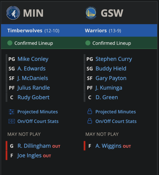 וויגינס היום בחוץ לאחר שעזב את המשחק בשישי באמצע. סטיב קר החליט לנסות היום עוד הרכב שלא נראה כמותו, אצל מיניסוטה הרוטציה יציבה. אין לי מושג למה ג׳ו אינגלס בחוץ כשראיתי אותו מתחמם, נאחל לו בריאות.