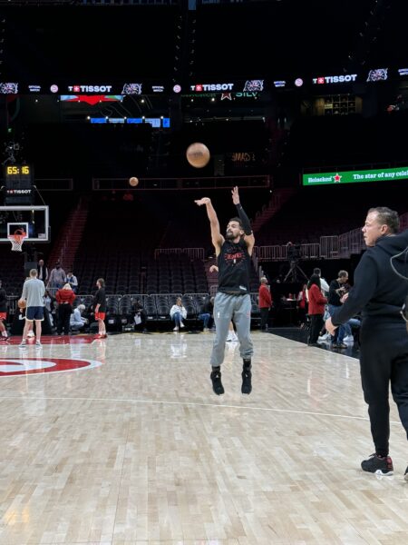 יוקיץ' יצא ראשון מחדר ההלבשה, כמעט שעתיים לפני המשחק, הוא בעיקר עבד על הג'אמפ הוק מחצי מרחק שלו וכמובן המון שלשות, בערך מכל פינה על המגרש, מדהים לראות שחקן כל כך גדול פיזית, מתנהל בצורה חתולית ומנסה המון זריקות בנפילה אחורה, קדימה ולצדדים, אין כמעט זריקה שהוא לא ניסה להתאמן עליה.