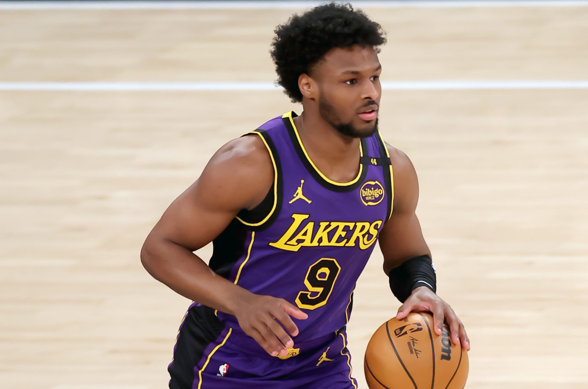בתמונה Los Angeles Lakers guard Bronny James brings the ball up court against the New York Knicks at Madison Square Garden. Brad Penner-Imagn Images