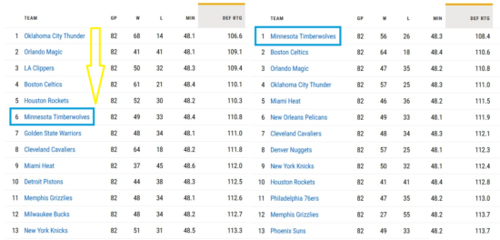 גם הטבלה לא משקרת. בעונה שעברה הרייטניג ההגנתי של מיני היה מקום ראשון!!! העונה הם עדיין טובים אבל ירדו למקום השישי. למי שמחפש את הלייקרס, הגנתית אין שינוי והם במקום ה17 בשתי העונות.