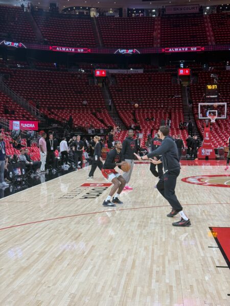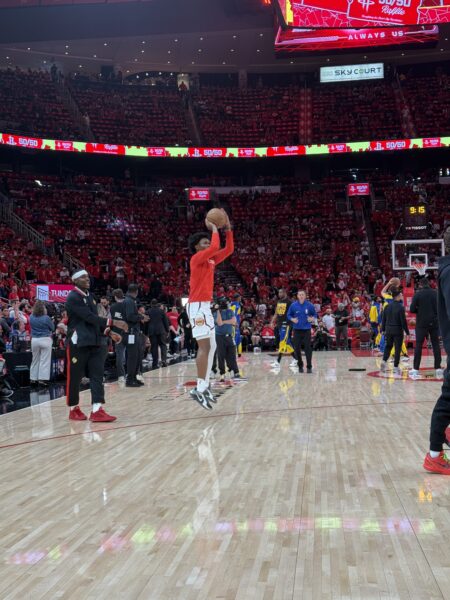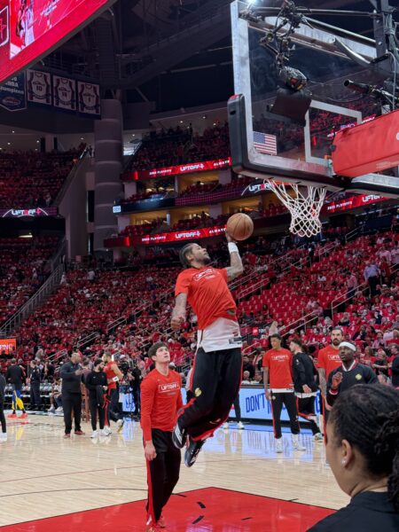 ואז הגיעו השחקנים, גרין מיוסטון יצא ראשון, את החימום שלו הוא בעיקר בילה מעבר לקשת השלוש, המון שלשות עם יד על הפנים של עוזרי המאמנים, והמון זריקות מהפינה, לקראת הסוף הוא גם הוסיף כמה דאנקים מרהיבים שגרמו לקהל להריע.