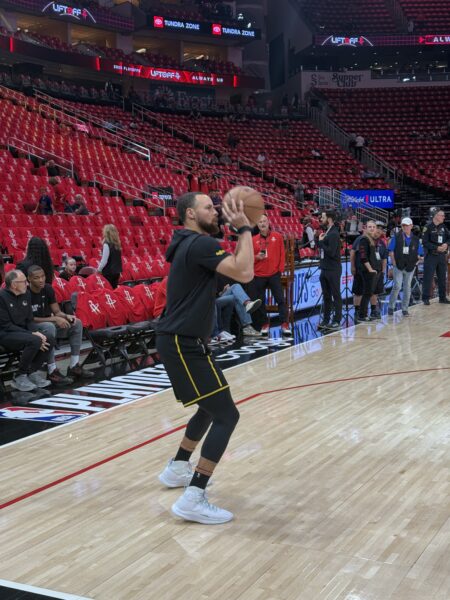 אצל גולדן סטייט, אם לא ראיתם מעולם את סטף קארי מתחמם, זאת חוויה אמיתית, ממש מופע שלם, קארי יודע שכולם צופים ואיכשהוא הוא מצליח לגרום לכולם להתמקד רק בו ובצורה המאד מיוחדת שהוא מתחמם, החימום שלו כולל מגוון זריקות, מליי אפים מתחת לסל, לזריקות בקשת גבוהה מהקרש לשלשות כמעט מחצי מרחק, הוא קולע כמעט הכל, תמיד בחיוך ותמיד עם ביטחון.