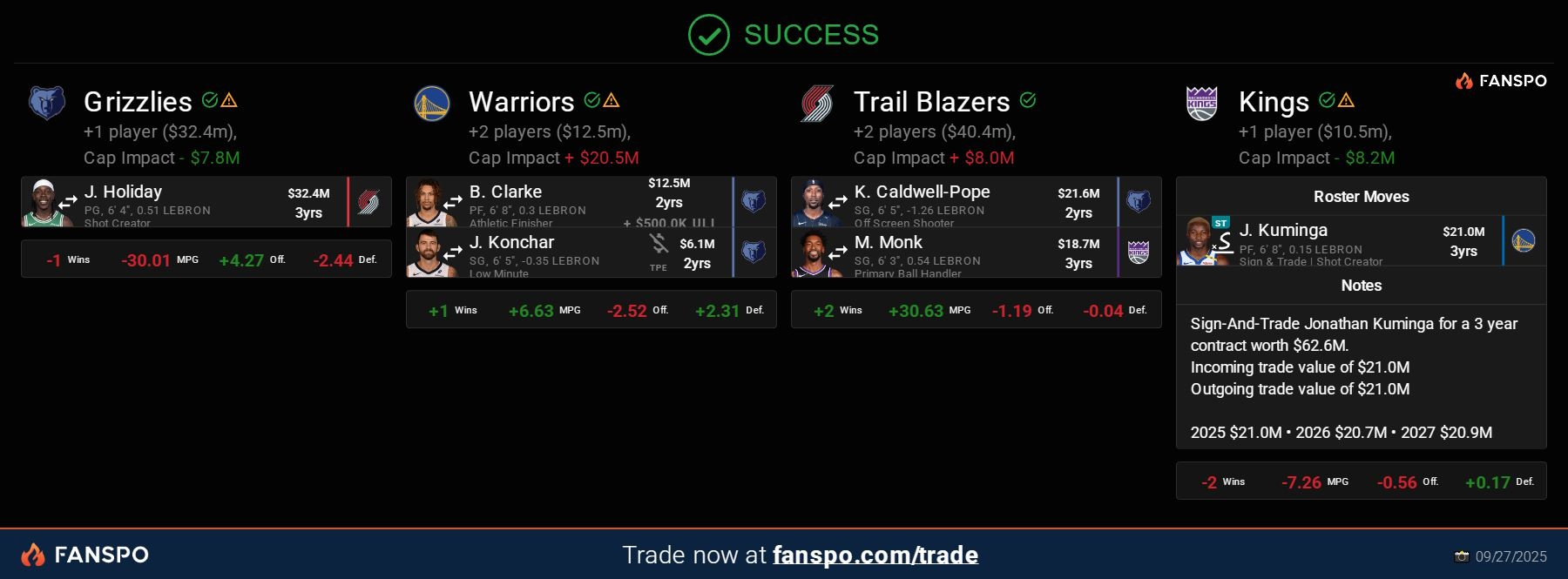 מסתבר שבניגוד למה שחשבתי אפשר להחליף את קמינגה ישירות במונק. קמינגה יקבל בשנה הראשונה 24 מיליון והטרייד עובר גם ב FANSPO וגם ב SPOTRAC. זה בהחלט מפשט את העסקה כיון שג"ס לא מעונינת לותר על מודי או באדי. אם הקינגס יסכימו לתת בחירת סיבוב ראשון ללא הגנה או הגנה מועטה למשל 1-2 (ג"ס ממילא מחרבנת בחירות כאלו, היסטורית) אז תהיה לנו עסקה.