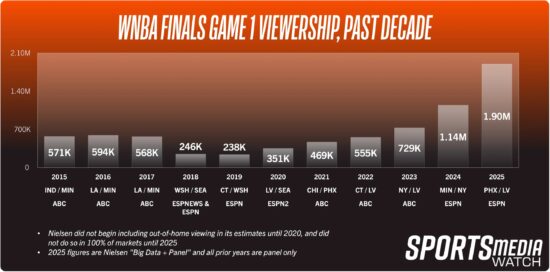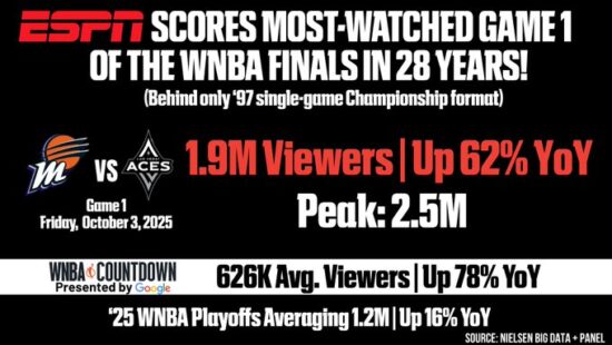 משחק מס' 1: ממוצע של 1.9 מיליון צופים ופיק של 2.5 מיליון (ESPN). עלייה של 62% לעומת העונה שעברה.