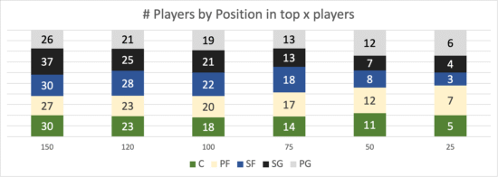 בין מאה השחקנים הטובים בעולם, העסק מתאזן מאד עם השונות הקטנה ביותר. 22 סמול פורוורדים, 18 סנטרים, ושלוש העמדות האחרות באמצע.