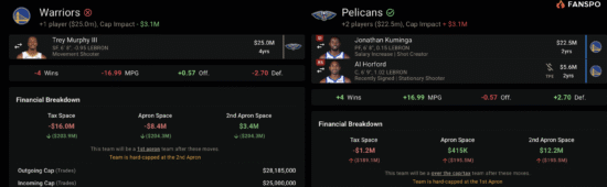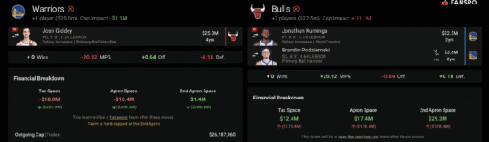 זה לא סוד שהקהל של גולדן סטייט, לא כל כך אוהב את פודג׳מסקי, אך הוא בהחלט בתנועה כלפי מעלה מבחינת יכולת. יחד עם קמינגה לבולס יש הרבה updside כאן אך הם מוותרים על אחת הפגיעות היותר טובות שלהם לאחרונה. כנראה שבחירות יהיו צריכות להיות חלק מהעסקה אך יש כאן סיטואציה שבה כל קבוצה מקבלת בדיוק מה שהיא צריכה, גידי יחד עם סטף בחלק האחורי של המגרש במיוחד עם הגודל שלו יכולים לכפות על קר לשחק גבוה גם כשהוא לא מתכוון לכך.