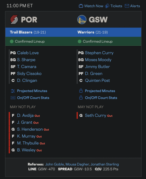 את משחקי יום שלישי ב־NBA נועלות הערב שתי קבוצות שנמצאות בקרב ישיר, צפוף ודי אכזרי על המקום השמיני והכל־כך משמעותי למאבקי הפליי־אין במערב. גולדן סטייט נמצאת במשחקה הרביעי במסגרת הום־סטנד הנוכחי בצ’ייס סנטר, ובינתיים המאזן מעורב: שני ניצחונות משכנעים על מילווקי ויוטה, לצד הפסד חד וברור לאטלנטה – קבוצה שהגיעה לביי עם הרכש החדש והנוצץ שלה, מקולום, להופעת בכורה מאז הטרייד, והשאירה ללוחמים הרבה מאוד חומר לדאגה/מחשבה לקראת ה-15 לחודש, בו קמינגה יוכל לעבור בטרייד. סה״כ גולדן סטייט בתקופה טובה עם 6 נצחונות מה-10 האחרונים, אך רובם נצחונות על קבוצות שהם אמורים לנצח אם הם מעוניינים להישאר קבוצה רלוונטית.