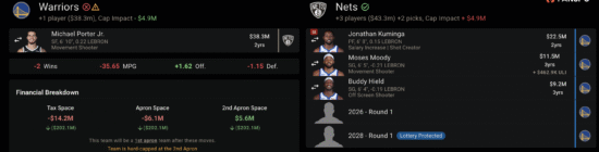 מהצד השני, ברוקלין מקבלת חבילה שמתאימה בדיוק למצב שלה: בחירות דראפט ושחקנים צעירים. קמינגה ומוזס מודי מביאים איתם תרבות של אליפות, רעב, ובעיקר פוטנציאל שעדיין רחוק ממיצוי מלא — אולי כזה שיוכל לפרוח תחת מאמן אחר, שהוא לא סטיב “שונא הצעירים” קר.