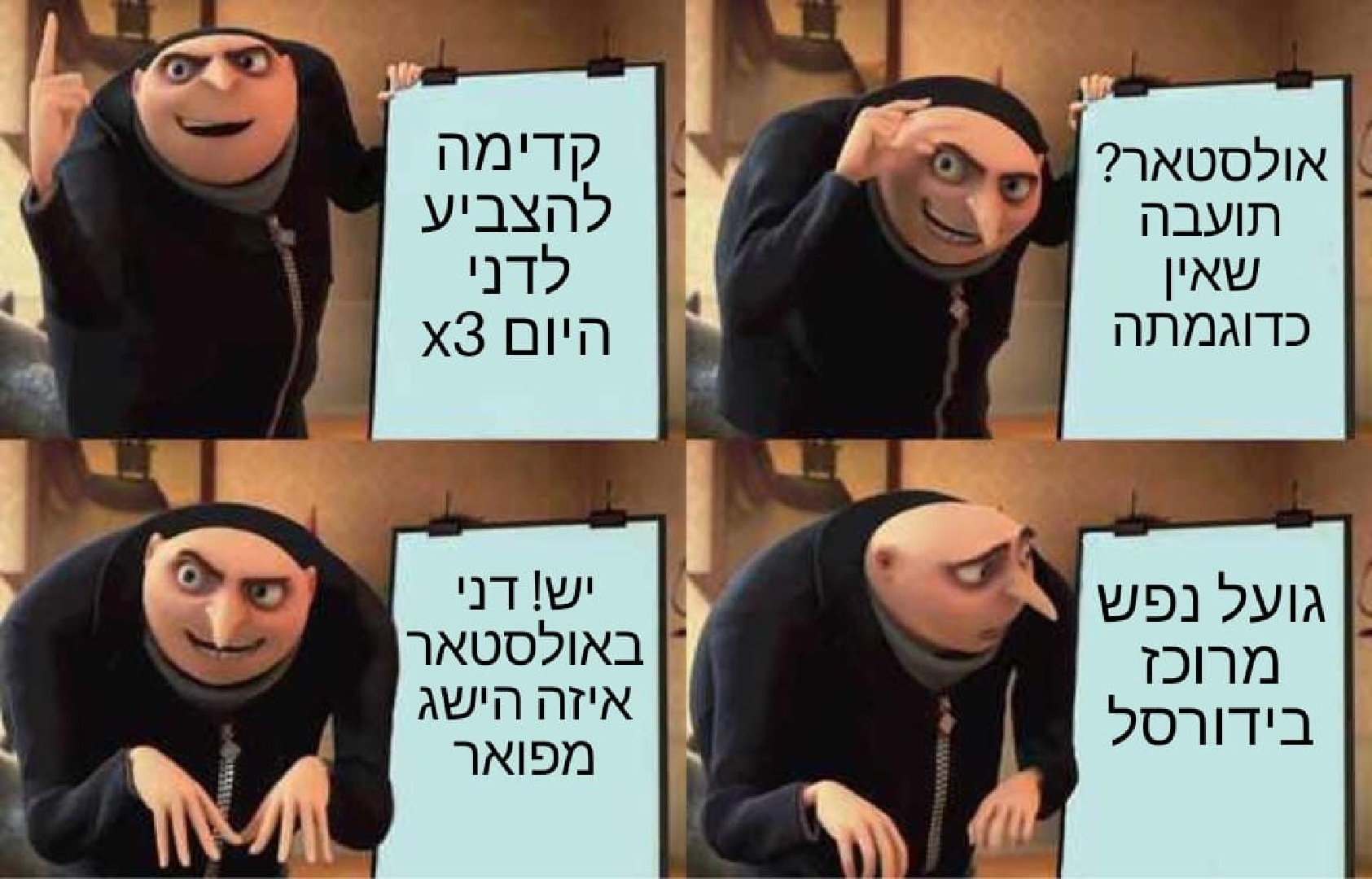 בענין אולסטאר , יפה ההתמדה משתלמת, דני הגיע לליגה על תקן ווירטואוז ,עשו לו בית ספר שם ,ברגע בו שעשו ממנו סמרטוט הגיע להחלטה המעידה על חוסן מנטלי ,זלוטיקמן לטעמי המוכשר יותר להבנתי לא היה מחזיקמעמד ,דני עבר מחליפת ווירטואוז לחליפץ המגן ,