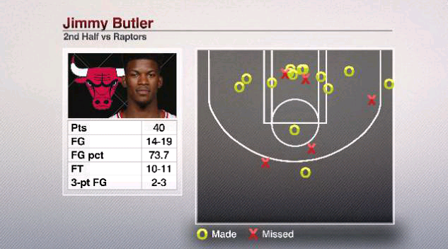 באטלר החל בשחיטה כשהבולס פיגרו ב-15. הוא קלע 21 ברבע השלישי ב-7 מ-9 (ו-7 מ-7 מהקו), ואז קלע 19 ברבע הרביעי, כולל שלשה כשהרפטורס מובילה ב-2 עם 30 טיקים לסיום: