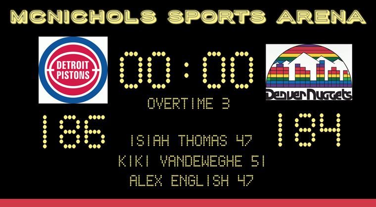 דטרויט קלעה רק פאול אחד משניים, ומצד שני דני שייס ודן איזל שמו סל כל אחד עבור דנבר, אבל מאוחר מדי, ולא מספיק, והמשחק מסתיים 184-186 לדטרויט.