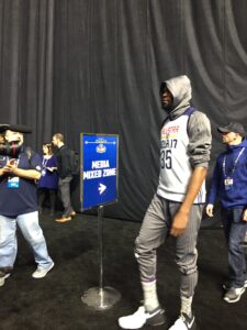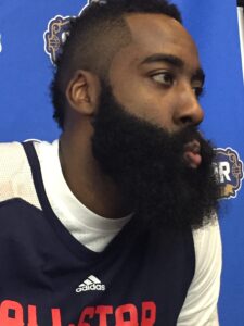 מיד לאחר כל אימון יש 45 דקות שמוקדשות לראיונות עם כל הסגל. ממש כמו אתמול ביום המדיה, סביב חדר גדול עמדו כיסאות שמול כל כיסא יש שלט המראה מי השחקן שיישב באותו כיסא. מכיוון שאתמול כבר תפסתי את קרי, ודוראנט ו-ווסטברוק היו מלאים באנשים, החלטתי ללכת לג'יימס הארדן.