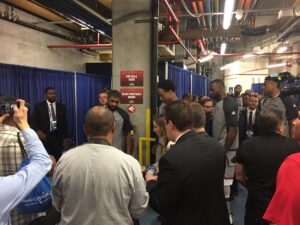 הייתי חייב לתת למאבטחים להבין שאני שונה מהשאר ולכם ברגע שהגעתי לפרקט ולפני שהספיקו להזיז אותי, תפסתי את מארק שטיין שנחשב לכתב מאוד בכיר בespn לשיחה קצרה בעברית.