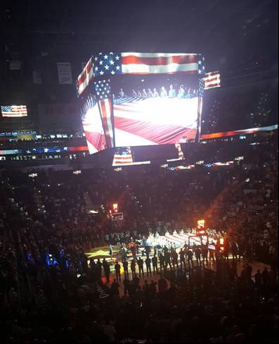 נחזור קצת לתיאורי הצבע של האולם והקהל. המשחק נפתח בסימן הצבא בשירת ההמנון על ידי חיילת אחת ששרה יפה ועל המגרש היו הרבה חיילים מיחידות שונות שהחזיקו דגל ענק. במחצית היה טקס השבעה של קדטים לצבא. מופע המחצית היה של אמן שעושה הופעה שבה הוא שר תוך כדי שהוא מצייר. הוא שר מאוד יפה והציור שלו היה גם משהו שאתה לא מבין מה הוא עושה עד שבסוף הוא הופך את התמונה ועושה איזה מריחת צבע אחרונה ואתה רואה דגל ארה"ב מתנוסס על פסגת איזה הר.